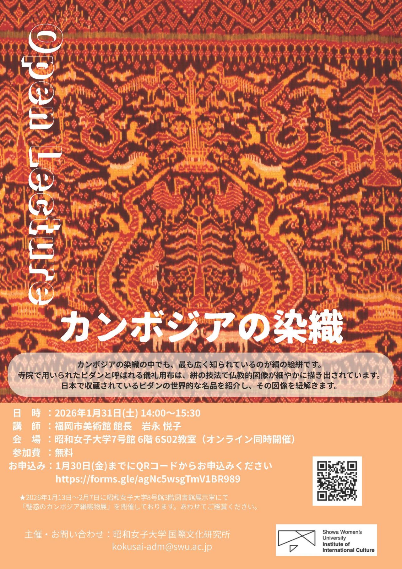 国際文化研究所は、本年度展示 第二弾として「魅惑のカンボジア絹織物展」を開催いたします。 「カンボジアは1970年代、東西冷戦の影響で内戦となり、伝統絹織物の伝承も危ぶまれましたが、織りを愛する人々と、それを応援する外国からの支援により、不死鳥のよ […]