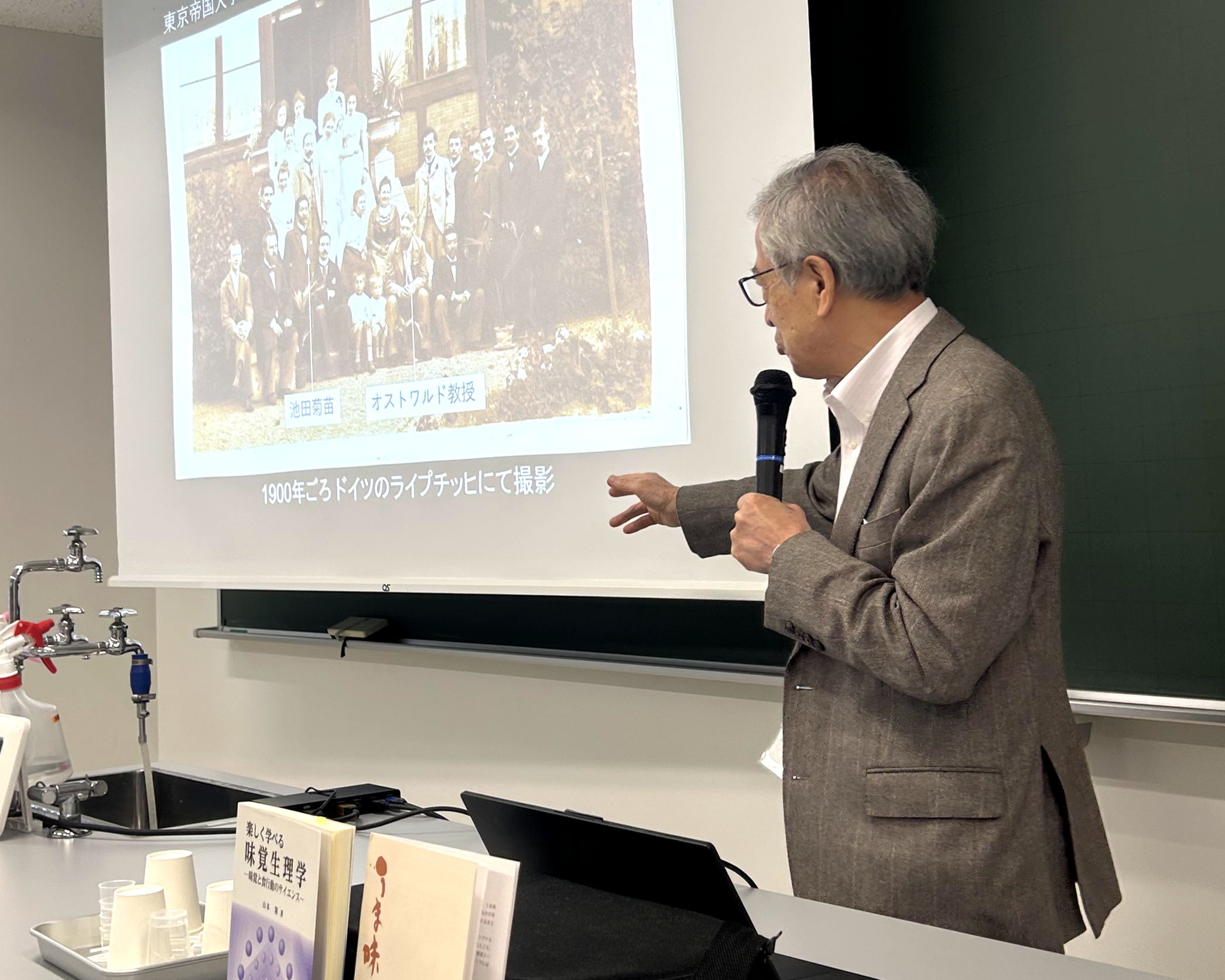 生理学実験「味覚生理」10月23日に、山本隆教授(大阪大学名誉教授、畿央大学名誉教授)に外部講師としてお越しいただきました。「おいしく味わう脳のしくみ」や「食べ物の好き嫌い」について研究されている山本先生は、味覚と食行動をご専門としています。