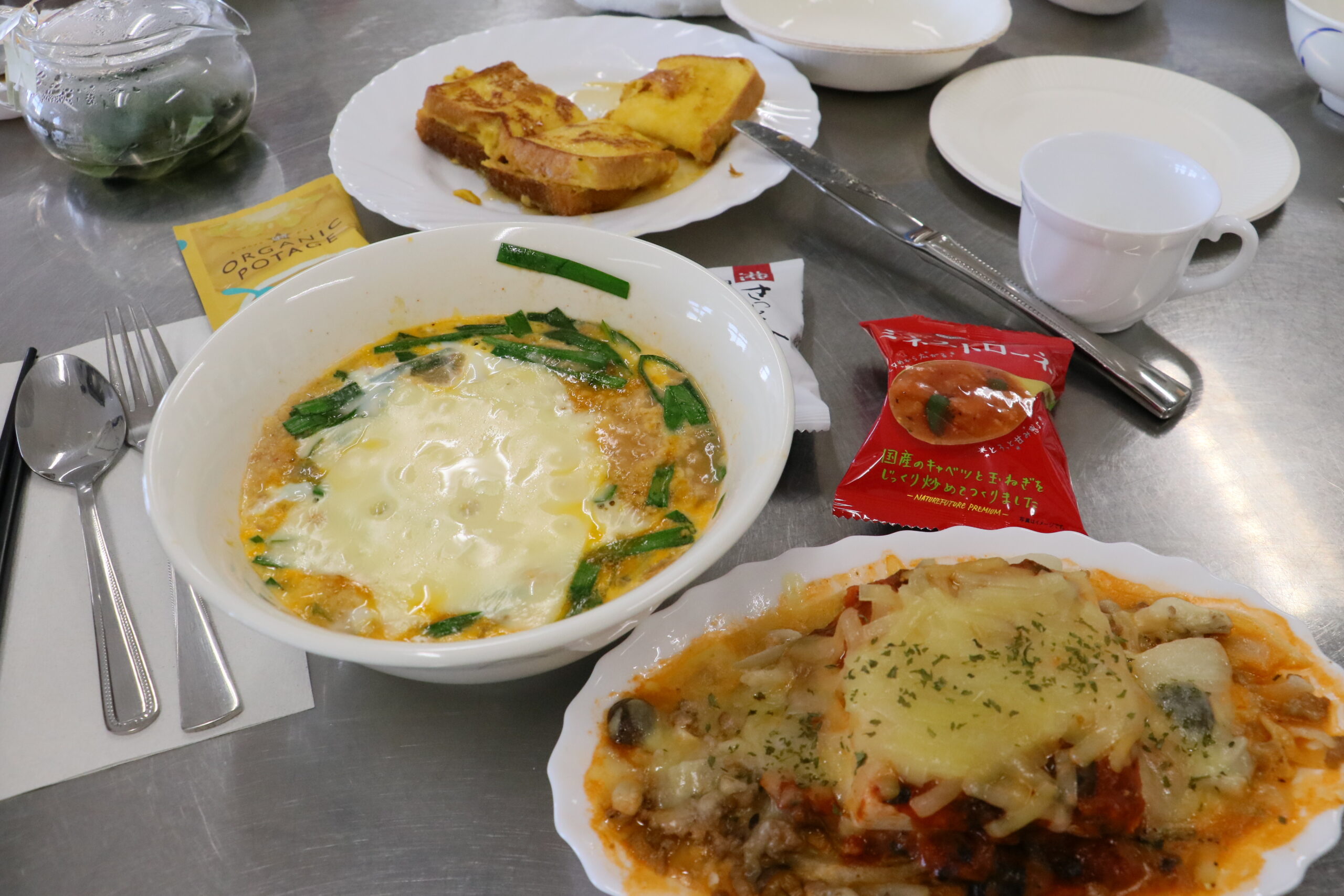 食安全マネジメント1班による「お食事フレンチトースト」は、『ORGANIC POTAGEコーン(株式会社コスモス食品)』を使い、砂糖不使用、時短で完成するのに、お腹がしっかり満たされる朝食向けフレンチトーストです。