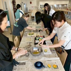 その後、食育体験として「摘果した青みかんを使ったドレッシングづくりとシロップづくり」を行いました。