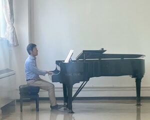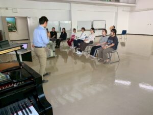 赤塚先生の伴奏で歌ったり、ピアノ演奏を聞いたりしながら、小学校第1学年の音楽科指導を学ぶことができました。