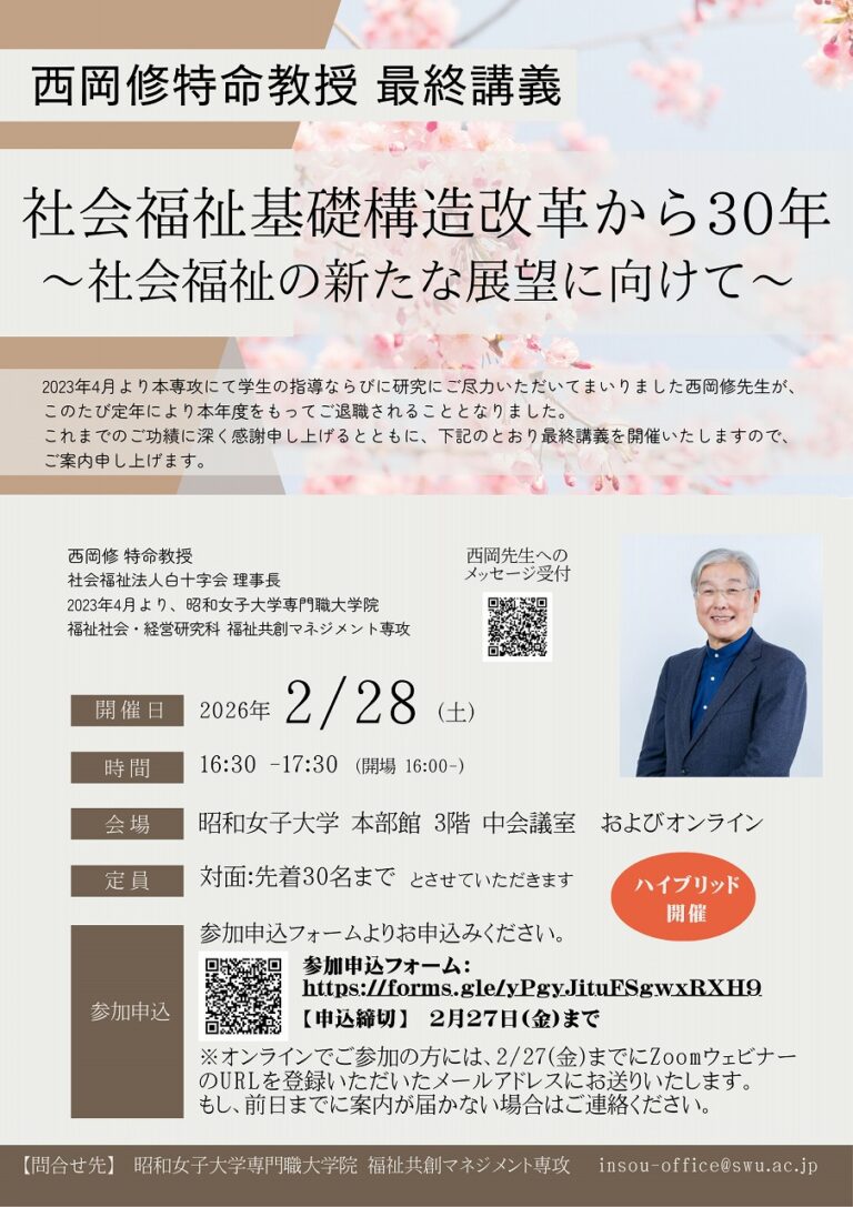 2023年4月より、本専攻にて学生の指導ならびに研究にご尽力いただいてまいりました西岡修先生が、このたび定年により本年度をもってご退職されることとなりました。 これまでの多大なるご功績に、心より感謝申し上げます。 西岡先生は、社会福祉法人白十字会 理 […]
