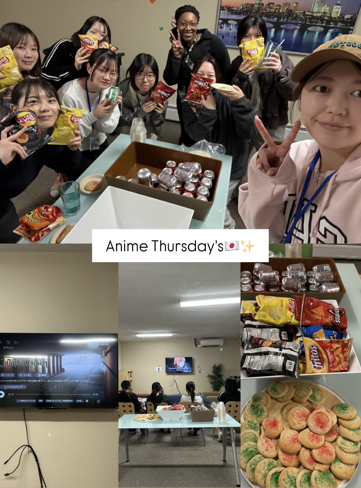 このイベントでは、日本でもアメリカでも人気のアニメをみんなで見ました✨アメリカに来てから気づきましたが、アメリカでは日本のアニメが本当に人気なんです!参加した学生からは「みんなでテレビを囲んでお菓子を食べながらアニメを見ることができて楽しかった」と感想をいただきました!