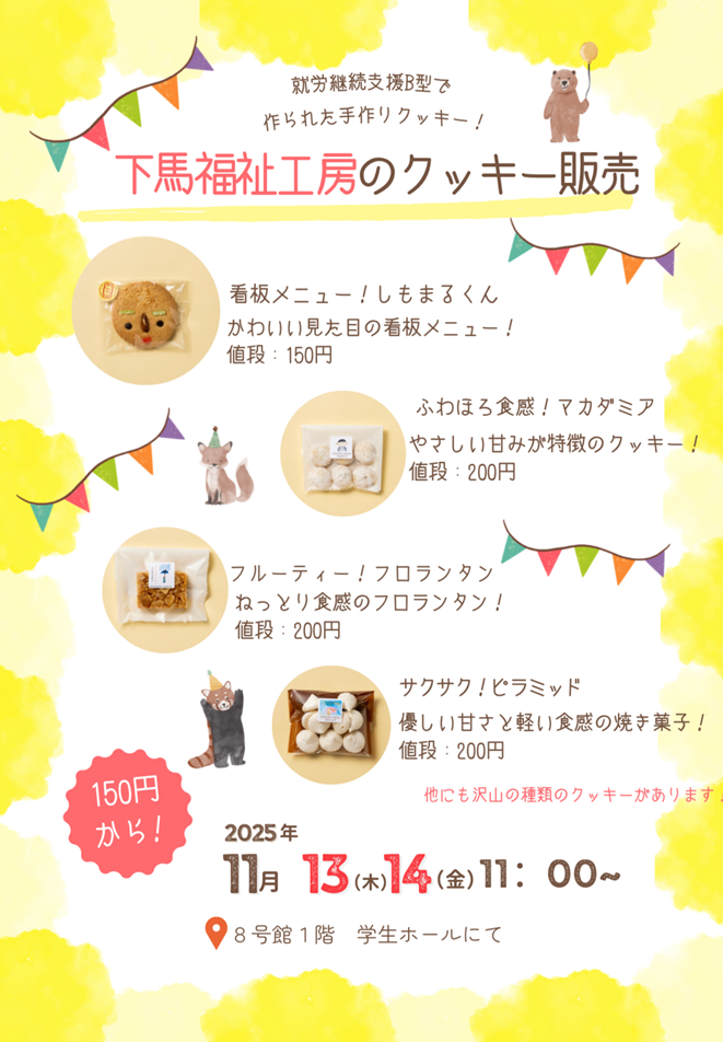 今後の活動としては、下馬福祉工房と地域を繋ぐ懸け橋になりたいという思いから昭和女子大学にて11月13日、14日に下馬福祉工房で製作しているクッキーの販売を予定しています。ぜひ足を運んでいただけると嬉しいです!!