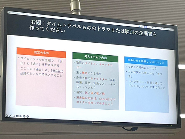 グループワークのお題は「タイムトラベルもののドラマまたは映画の企画書を作ってください」というもの。レクリエーションのような楽しいお題ですが、その「答えのなさ」に戸惑い、ワークの序盤では沈黙が続いてしまいました。
