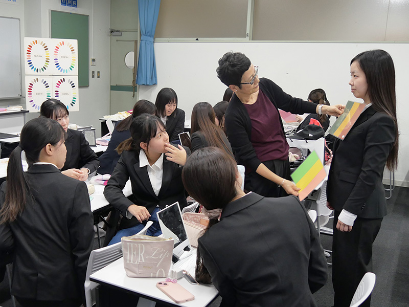 肌の色や地毛の髪色、瞳の色などを見て診断するのですが、先生が各グループを見て回り、判断に迷う学生にも一人ひとり丁寧にアドバイスしてくださいました。