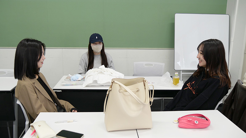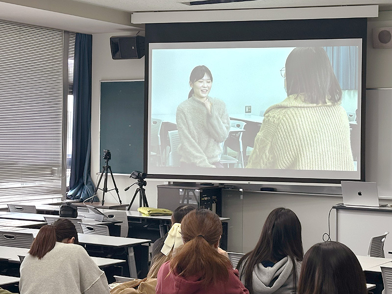 その後、代表者2人×3組が実際にカメラで撮影しながら対話を行いました。私もその中の1人として実際に体験させていただきました。カメラで撮影されているという緊張感の中、最初は少し恥ずかしさもありましたが、対話の相手としっかり向かい合って話すうちに、自然と心が開くような感覚がありました。机という障害物のない空間で椅子に座って向かい合うというのは、日常ではあまりない状況です。その空間で話すことで、相手との距離感が縮まるとともに、2人だけの温かい空間が生まれていることに気づきました。すると不思議なことに、自分の気持ちを素直に話すことが出来るようになり、相手のことをもっと知りたいと思うようになりました。