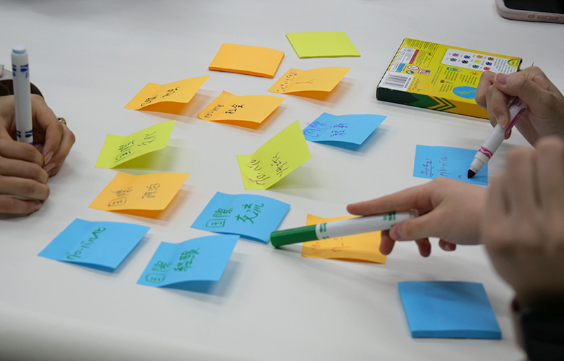 今回のワークショップでは、まず始めに「グローバル○○、グローバルな○○」と「国際○○、国際的な○○」について思いつく言葉を付箋に書き出し、「グローバル」と「国際」の共通点と相違点について考えました。どちらの言葉も日常でよく使用されますが、「グローバル」は地球規模の大きな概念、「国際」は国と国の関係に焦点を当てた概念であることを学びました。