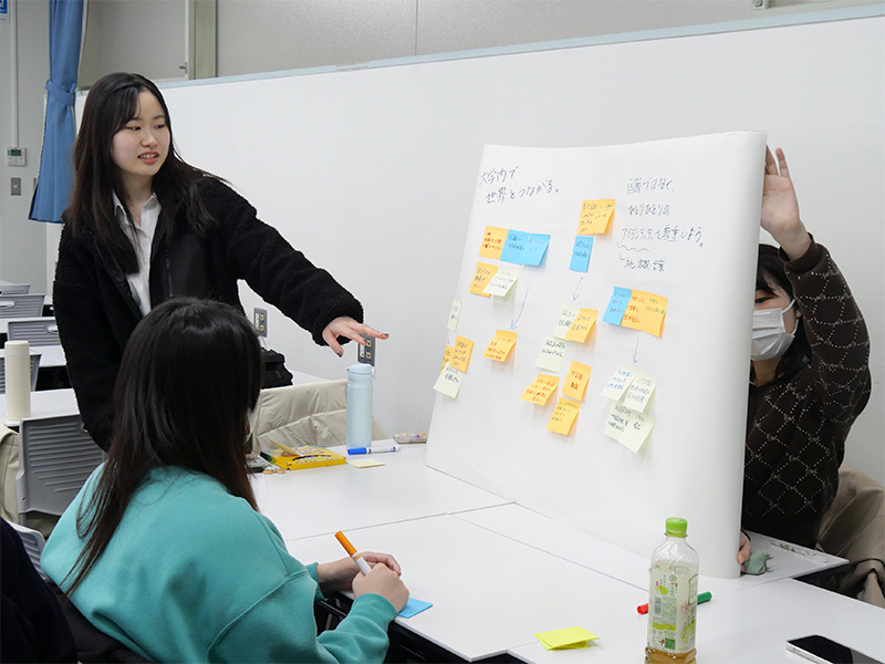 私たちのグループでは、国際交流に興味があっても言語や文化の違いから一歩を踏み出せない学生が多い一方で、さまざまな地域の人と関わり視野を広げたいと感じている学生も多いことが話題に上がりました。そのうえで、学内にいるだけで国籍にとらわれず自然に交流が生まれる環境をつくるために、より多くの国・地域から留学生を迎え、国際交流の授業やイベントをさらに充実させる案が出ました。また、ほかのグループでは、学寮研修を昭和ボストン(本学の海外キャンパス)で行うという提案もあり、非常に興味深かったです。