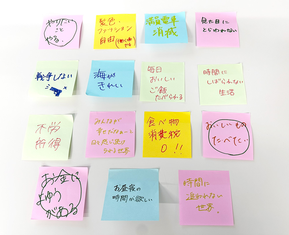 「お昼寝の時間が欲しい」や「満員電車をなくしてほしい」といった個人的な理想から、「時間に追われない社会」や「競争しない社会」「空気がきれいな世界」といった社会的な理想まで、さまざまな意見が出てきました。日常の中の“当たり前”となってしまっていることでも、モヤモヤしたり、「こうなったらいいのに」と思うことは、きっと誰にでもあると思います。