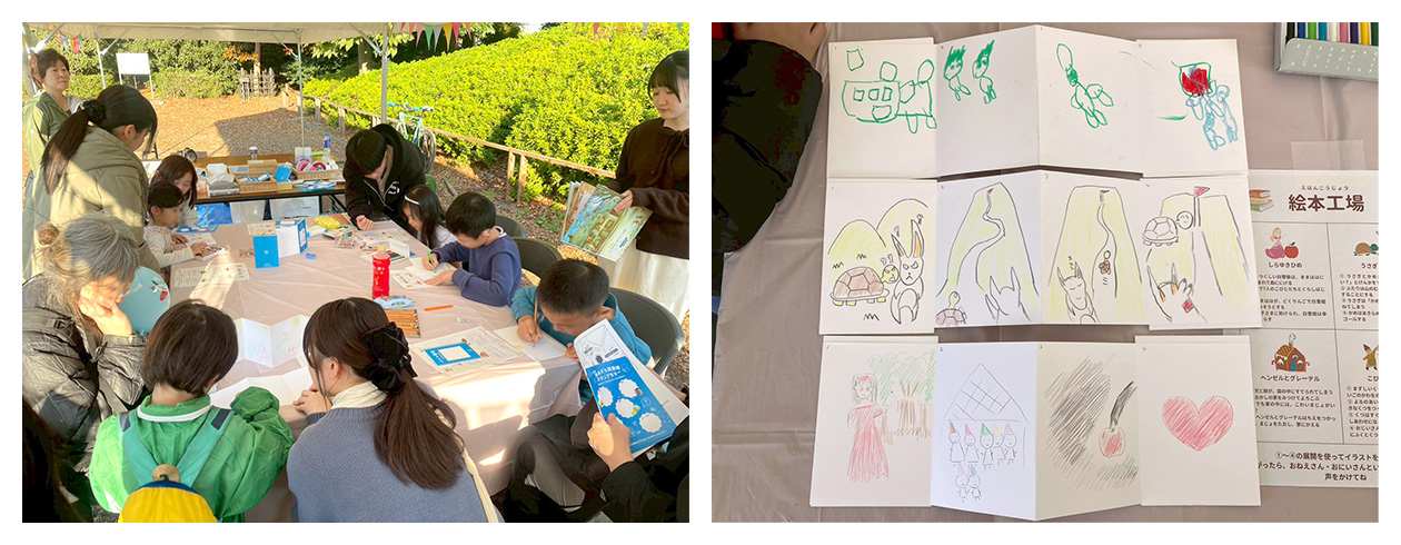 「絵本工場」では、世界に一つだけの絵本を作ろうという目的のもと、多くの人が思い思いにお絵描きに没頭していました。子どもだけでなく親御さんも一緒になって取り組んでおり、コミュニケーションが活発に行われていました。創造力を膨らませながら自分の書いた絵本を大事にしてくれている様子を見て、思い出として持ち帰ってもらえるものが提供できたように感じます。