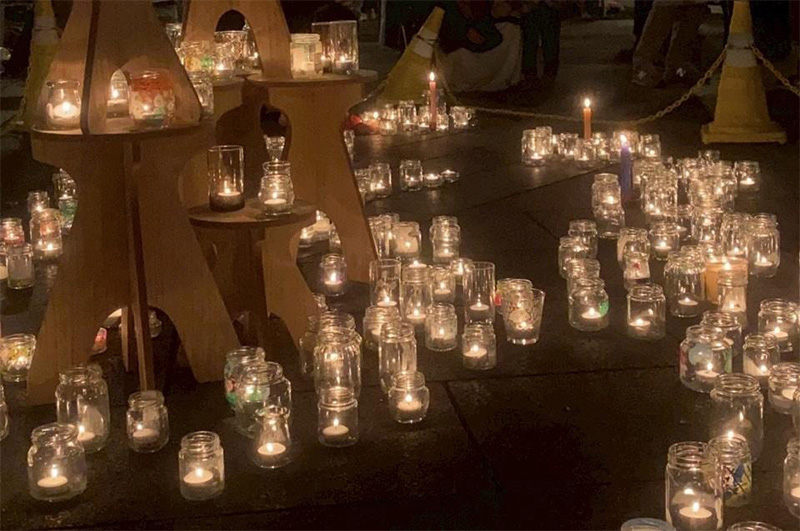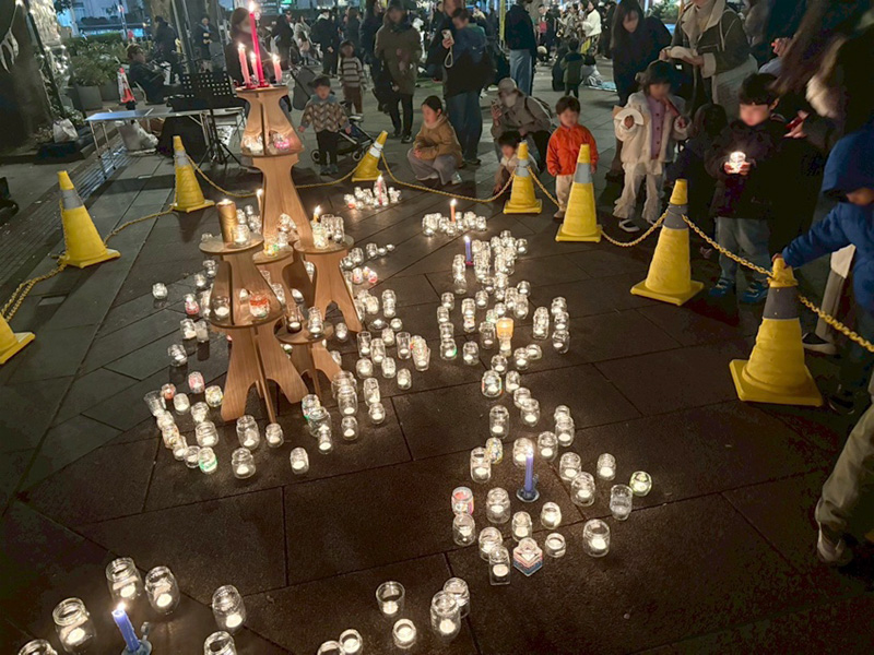 夜になると、完成したキャンドルに火が灯され、けやき広場は幻想的な空間へと変わりました。自分で作ったキャンドルと一緒に写真を撮る人や、通りがかりに足を止めて眺める人の姿も多く見られました。