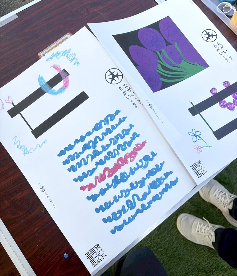 ミニワークショップでは、4名の作家によるアート入りポスターの中から気に入ったものを選び、「世」の文字に描き足すアートワークを行いました。子どもから大人まで、さまざまな画材を使って思い思いに制作に取り組み、個性あふれる作品が次々と生まれていく様子が印象的でした。私たち自身も、多様な表現に触れる楽しい時間を過ごしました。