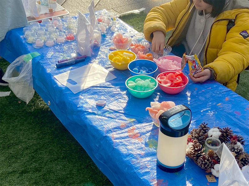 キャンドルワークショップでは、空き瓶に絵を描き、色や形の異なる蝋を入れてオリジナルキャンドルを制作しました。参加した子どもたちは作品づくりに夢中で、保護者の方も一緒に楽しんでいる姿が見られ、会場全体が和やかな雰囲気に包まれていました。