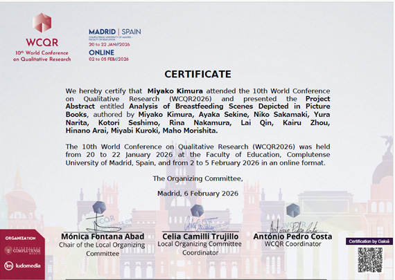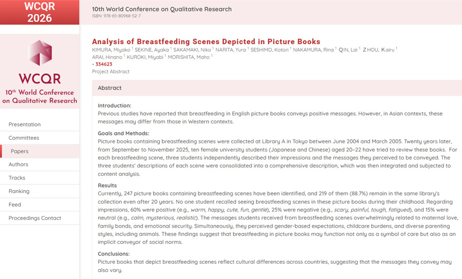 ゼミで行った活動,研究成果をまとめたAbstract(抄録)が,国際学会10th World Conference on Qualitative Researchの査読を経て採択され,2月5日にオンラインで,“Analysis of Breastfeeding Scenes Depicted in Picture Books”というタイトルの発表を行いました。こちらがProceedings(学会講演集 ISBN: 978-65-80968-52-7)に収載されたAbstract(抄録)です。