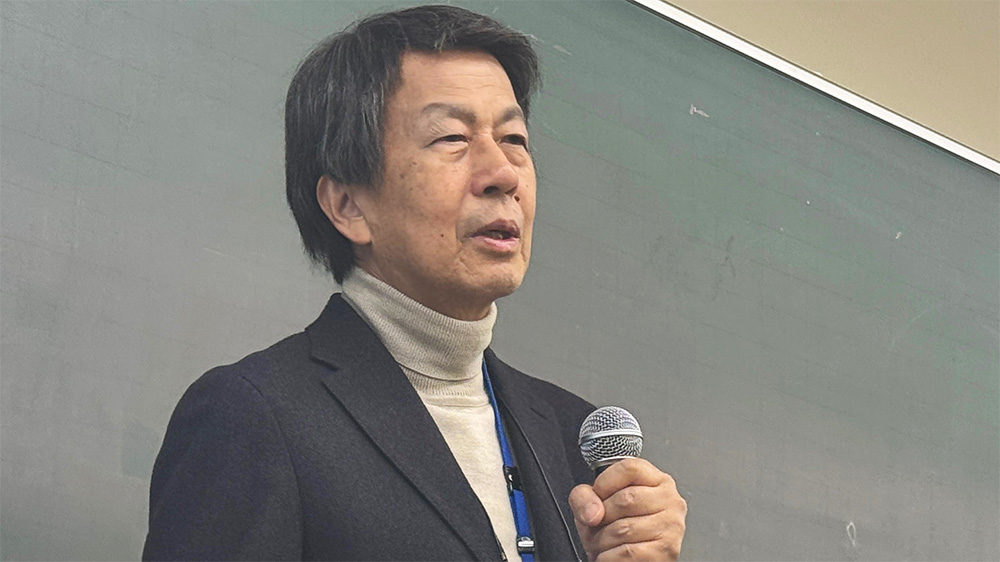 1月14日(水)の「マスメディアと現代社会」の授業にて、昭和女子大学客員教授の板野裕爾先生にご講演いただきました。板野先生は、NHKの報道局経済部門を中心に要職を歴任し、福島放送局長、NHK専務理事・放送総局長、NHKエンタープライズ社長を務めてこられました。