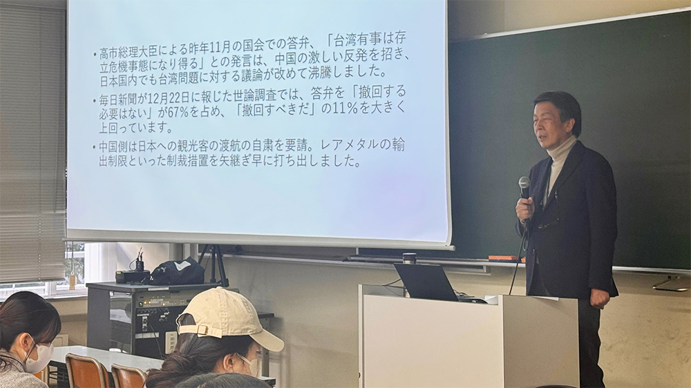 今回は「高市政権の政治」をテーマに、経済政策や安全保障をめぐる発言、オフレコ発言の報道、衆院解散などについて講義が展開されました。