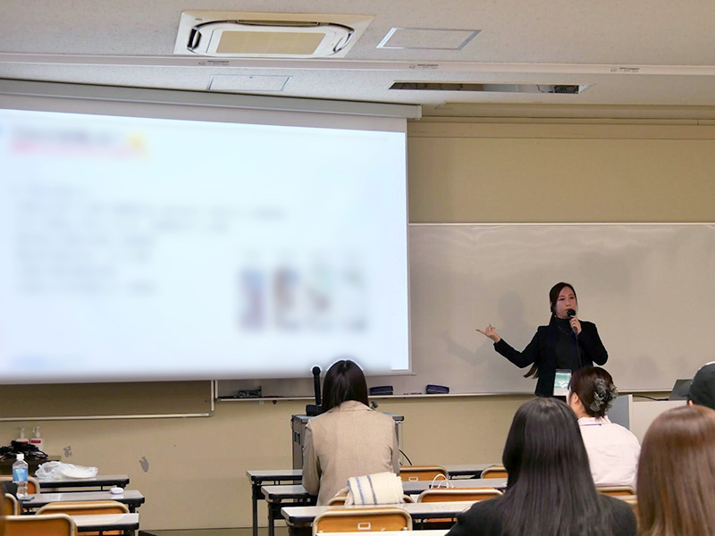 最後に、昭和女子大学のOGである小野真菜美さんからは、コロナ禍における就職活動や、志望先企業選びに向けた準備についてお話いただきました。当初は国際学科卒業ということもあり、旅行業界や航空業界を志望されていましたが、大学3年時のコロナ禍を機に、メーカーや専門商社、リース業界へと視野を広げ、早期から大学のキャリア支援センターを活用する中でTDKに出会われたそうです。就職活動中は、ご自身で情報を集められ、企業の事業活動の流れを価値創造の観点から把握するバリューチェーン分析なども行ったとお話されていました。また、入社後の自己成長を見据え、読書を通じた言語化力の向上や資格取得などの「インプット」と、グループワークなどでリーダーを務める「アウトプット」の両面から、着実に準備を進められた姿勢がとても参考になりました。