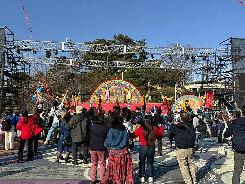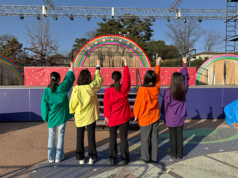 そして、「夕日の丘ライブ!」のエンディングで、私たちもお客様と一緒になって紙テープをステージに向けて投げました。当日は、風が強く、ステージまで届きませんでしたが、キャストの皆さんや来場してくださったお客様、そして私たち学生も含め、その場にいた全員が笑顔になって一緒に楽しむことができた貴重な時間となりました。