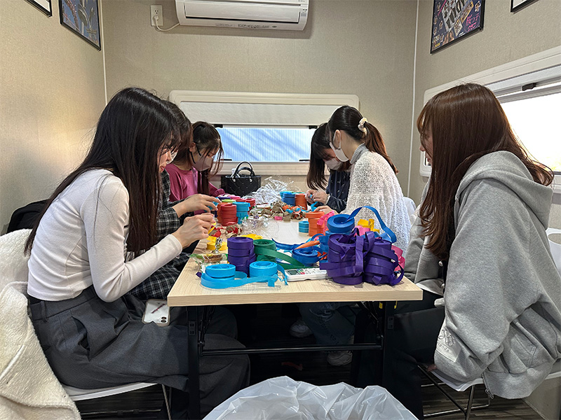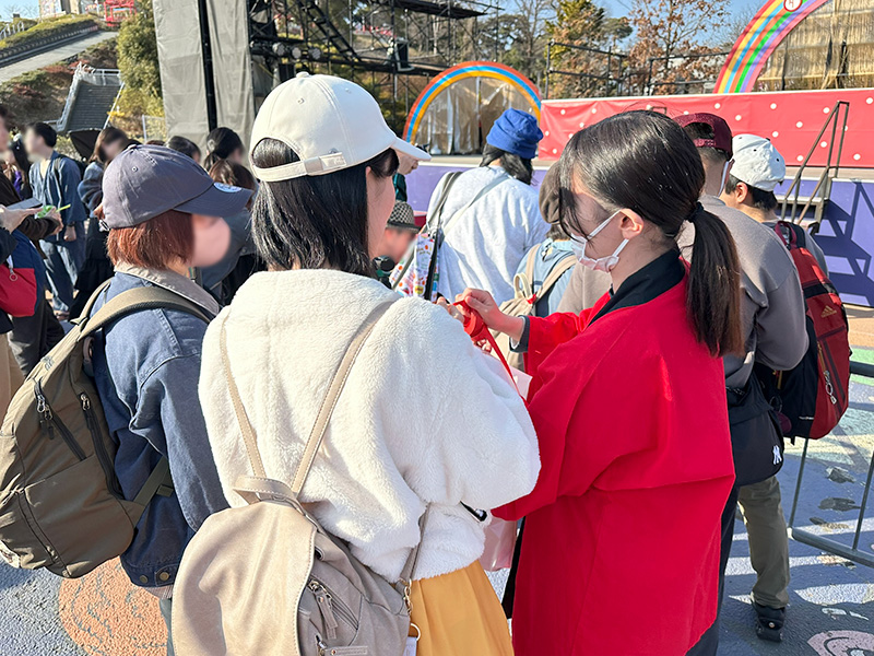 コラボイベントの最終日、私たちは西武園ゆうえんちを訪れ、ご準備いただいていた紙テープの芯を安全のために抜く作業や、投げた紙テープの軌道や飛距離の確認など、事前準備を行いました。その後、イベント開始の直前に、学生は西武園ゆうえんちさんの法被を纏い、ステージ前に集まったお客様にスタッフとして紙テープを配布し、投げ方を説明するなど、実際のイベント運営にも関わらせていただきました。