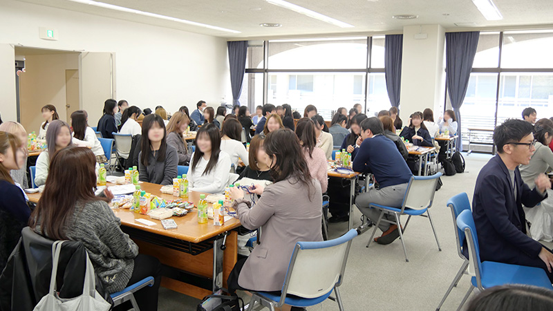 入学者向けガイダンスを終えた新入生が会場へ到着したら、いよいよ「上級生主催懇談会」のスタートです!新入生・上級生・教職員で一つのテーブルを囲み、昼食を食べながらコミュニケーションを取る貴重な機会に、3・4年生の先輩方も駆けつけてくれました。
