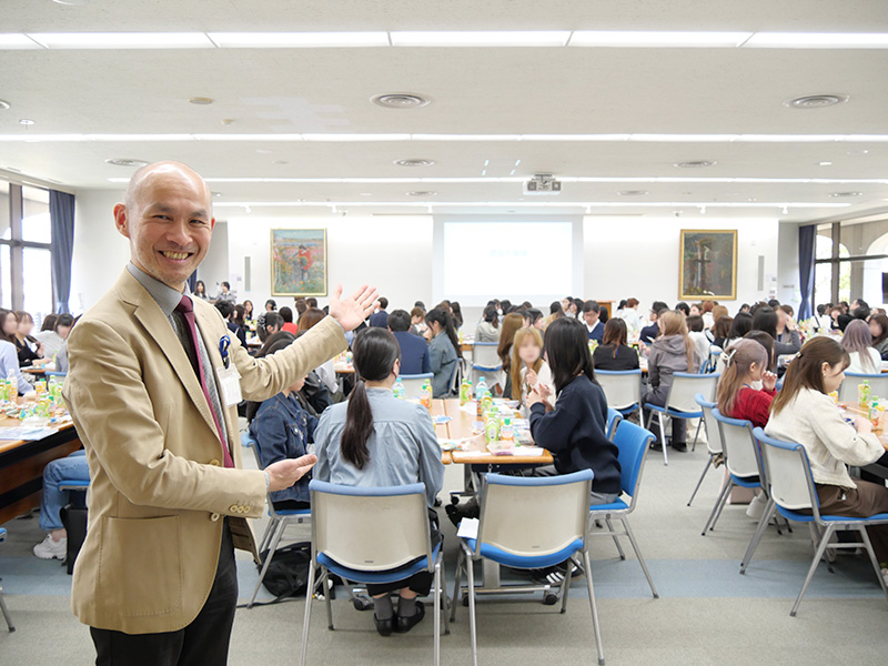 アイスブレイクのあとは、テーブルごとの交流に移りました。「話したことがない人とも話すきっかけを作ってほしい」という思いを込めて、新入生の座席はランダムに決めました。質問カードや、上級生・教職員の自己紹介カードを活用することで、新入生から積極的に質問が生まれ、会話が広がるきっかけになりました。どの班も和気あいあいとした雰囲気で、履修や行事といった学内の話題だけでなく、アルバイト・サークル・プロジェクト活動など、大学生活ならではの話題も多く聞こえてきました。あっという間に交流の時間は終わってしまい、終了のアナウンスを行った際には「終わるのが早かった」といった声も上がり、新入生が楽しんでくれたことを実感しました。