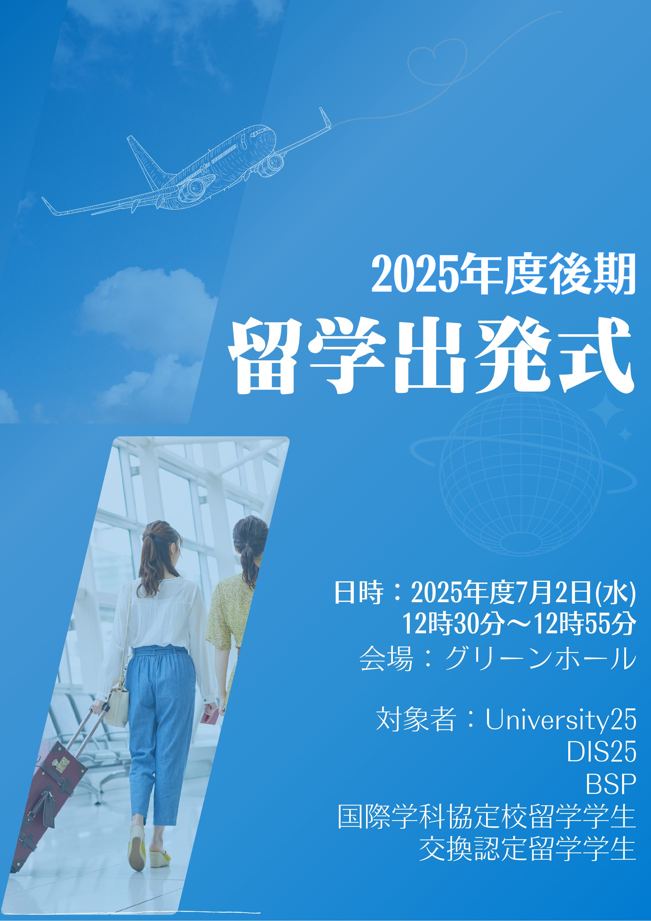 本年度後期からそれぞれの留学先へ旅立つ学生256名を対象に グリーンホールにて2025年度後期留学出発式を執り行いました。 2024年度に昭和ボストン留学ウィングリーダーを務めた英語コミュニケーション学科3年生の白石さんが英語で司会を務めました。 ま […]