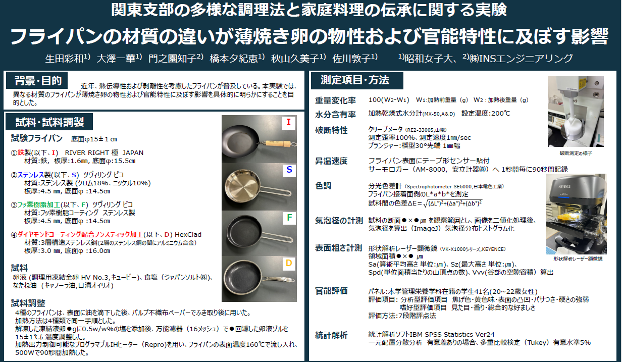 特別企画「多様な調理法と家庭料理の伝承」では、「フライパンの材質の違いが薄焼き卵の物性および官能特性に及ぼす影響」という演題が採択され、発表を行いました。