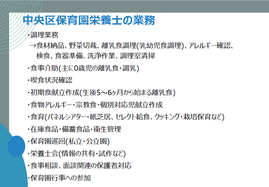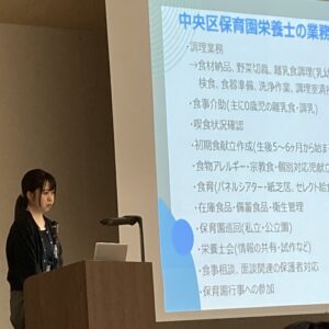 山本さんからは、保育園栄養士としての具体的な業務内容について、スライドを用いて分かりやすくご説明いただきました。