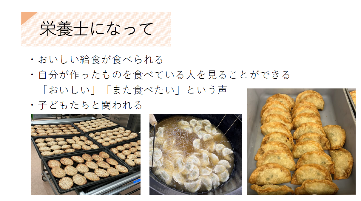 「1日の流れ」や「これからの栄養士・管理栄養士に求められること」など、実務に直結する内容が紹介されました。
