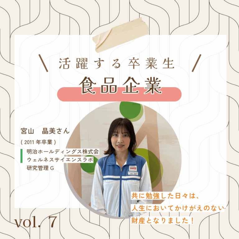 本日ご紹介する卒業生は、明治ホールディングス株式会社※で研究職としてご活躍の宮山 晶美さんです。宮山さんは、「管理栄養学科の皆さんも、これからさまざまなライフイベントを迎えると思いますが、一人の女性として生き生きと社会で活躍されることを、卒業生として […]