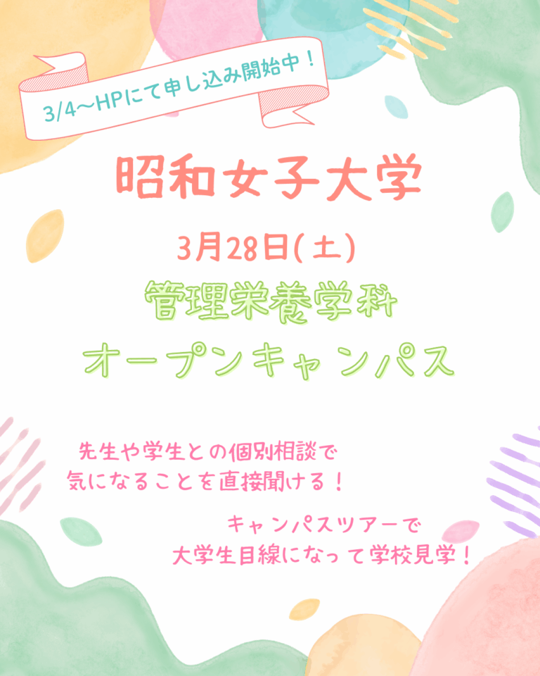 こんにちは!食健康科学部 管理栄養学科です。 日差しが春めいてきましたが、皆さまはいかがお過ごしでしょうか。 昭和女子大学では、3月28日(土)にオープンキャンパスを開催いたします! 在学生や先生が、みなさんの「知りたい!」にお答えします️。 大学生 […]