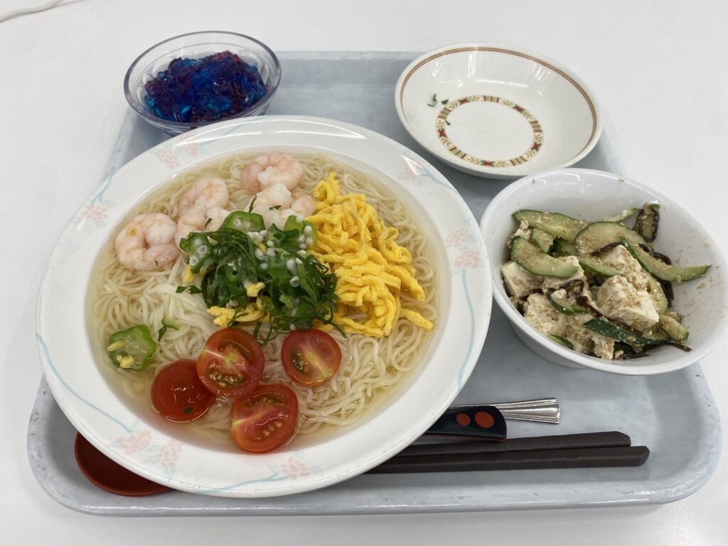 配膳時はトッピングを小皿に分けて提供しているので、ご自身でそうめんの上に飾ってお食べください。☆七夕ゼリー