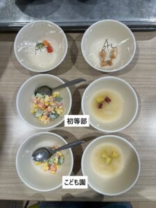 📸写真の右列中央、下のお皿はどちらもスープが入っており、中央は隣接する初等部に提供されるもの、下はこども園で提供されるものです。
