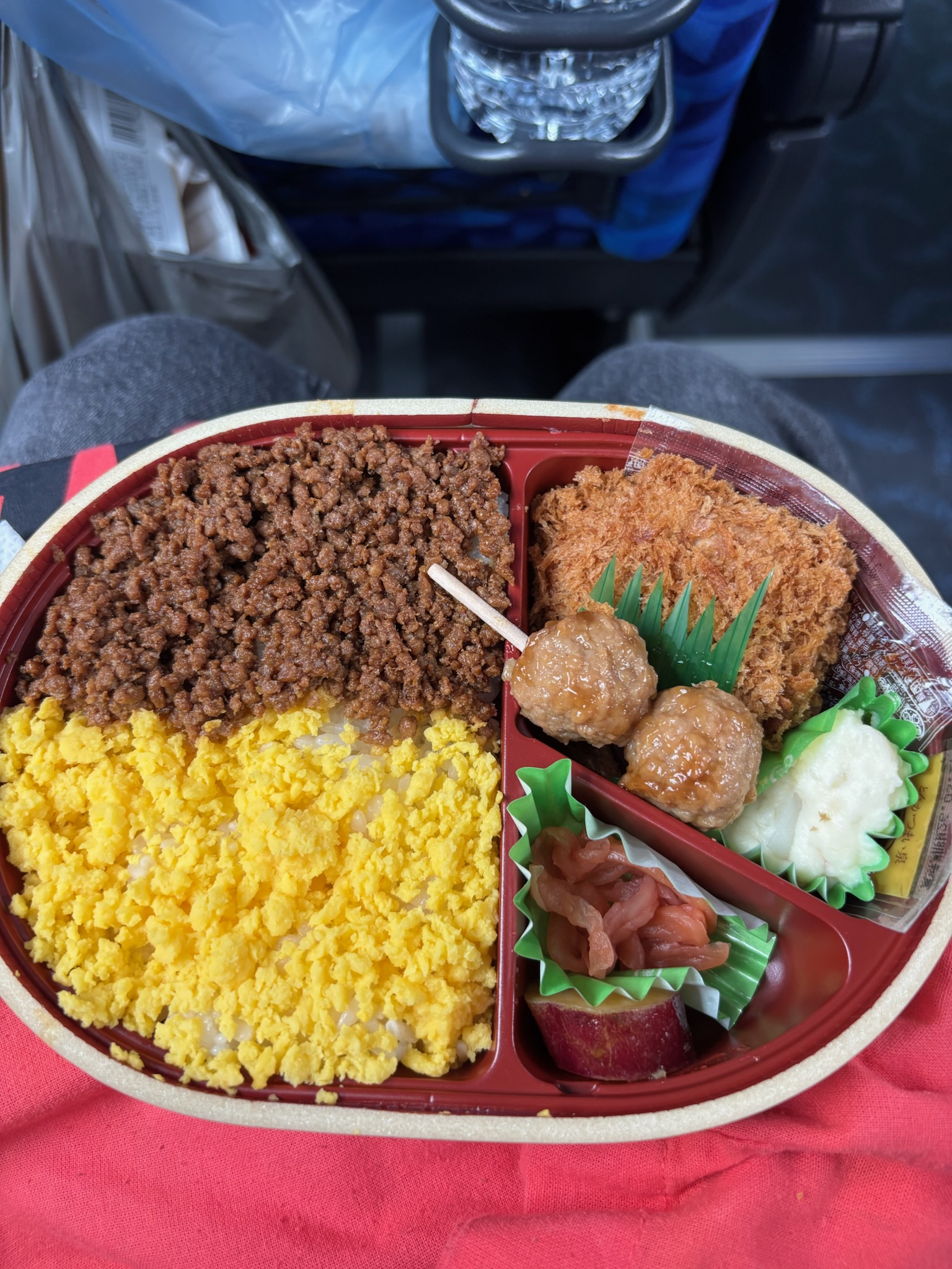 お昼ご飯は、当初箱根恩賜公園で食べる予定でしたが、雨が降ってきてしまったため、バスの中でいただきました。まい泉の鶏そぼろ弁当は絶品でした!