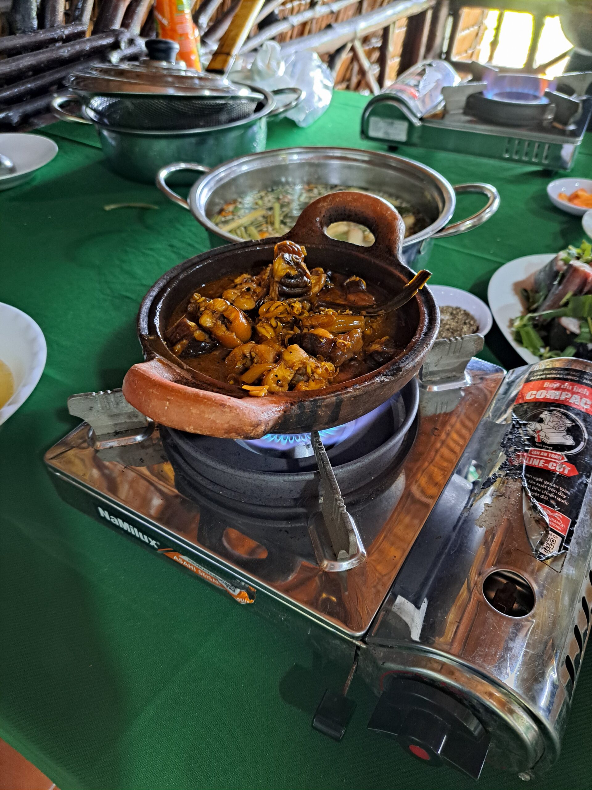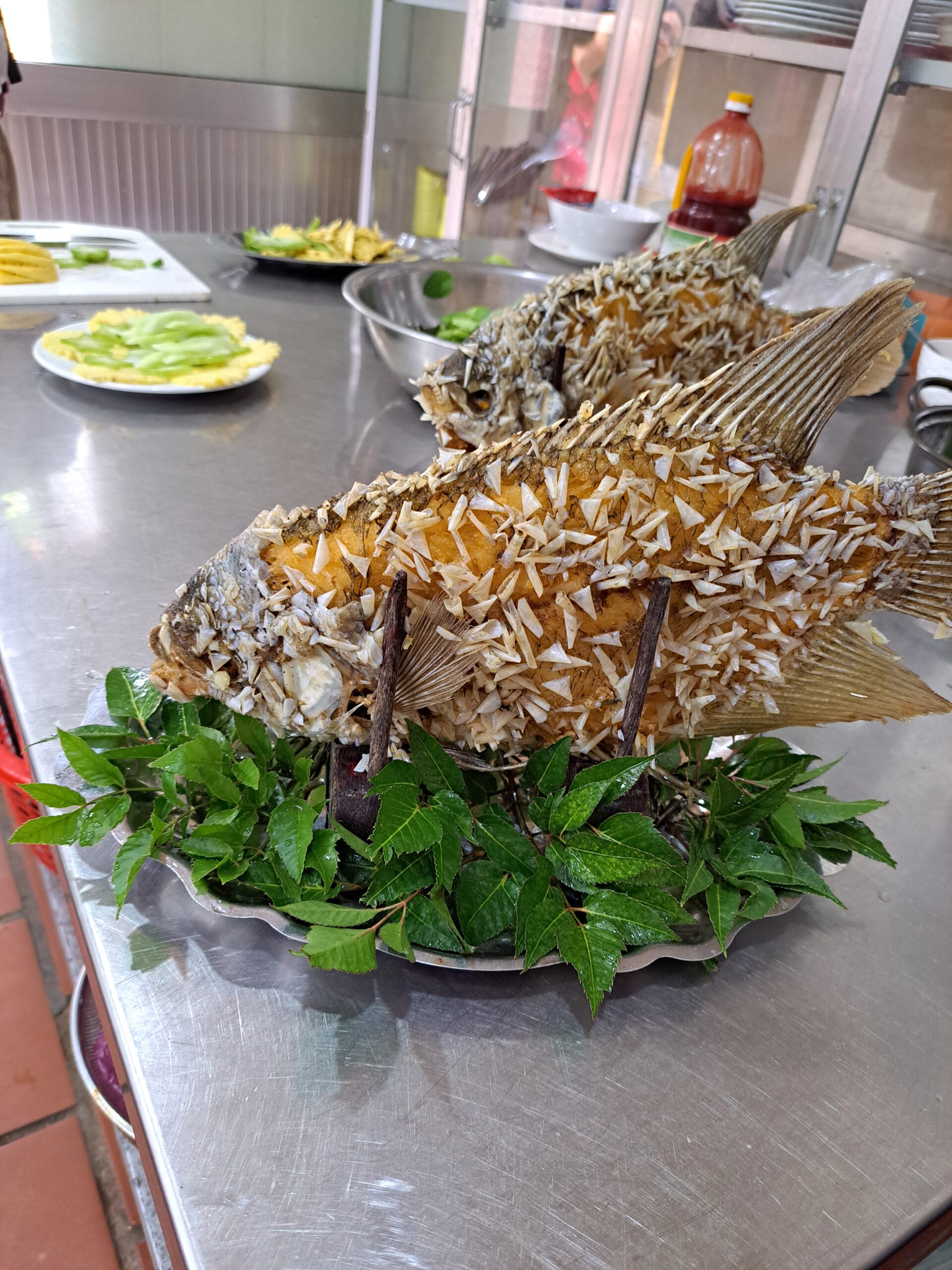 エビの発酵調味料、海老せんべい、ミルク煎餅、ヌードルスープ(ブン・スオン・ビット)、総菜入り揚げパン、黒鶏料理、生春巻き、シジミ料理、魚つくねのかぼちゃ花被揚げ、エレファントフィッシュ揚げ、うなぎ煮込み、各種鍋料理などベトナム国外ではまだ知られていないものや地域の食習慣が強く反映されたものまで、幅広いジャンルの食品、調理品に出会うことができた。例えば、生春巻きは、日本でもよく食べられる代表的なベトナムフードであるが、今回の調査先では、紫蘇、サクラタデ、ツルムラサキ、香菜、シカクマメ、スターフルーツなども入り、付けダレにはエビの発酵調味料マムトムチャーを付けて食べるというスタイルであった。フォーは、日本で知名度も高く人気もあるが、実はベトナムではブンという米粉からつくられる押し出し麺がよく食べられている。しじみのココナッツバインカインは、タピオカ麺のもちもち食感が美味しく、シジミをココナツミルクとシンプルな味付け仕上げた日本でも好まれるであろうメニューである。エレファントフィッシュ揚げは、最近はSNSなどでも見かける映える外観の一品である。うなぎも郷土料理として食されている。日本とは異なり、ぶつ切りにしたウナギに、レモングラス、チリソース、味の素、ヌクマム、コショウ、塩を加えて味付けしたもので、ご飯が進む一品でした。