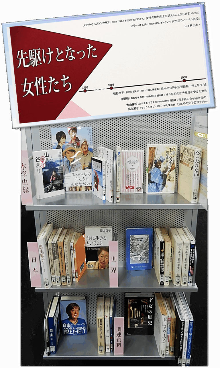 図書館では、ミニ展示「先駆けとなった女性たち」を開催中です。 この展示では、「初」を成し遂げた女性たちに焦点を当て、その足跡を伝える資料を「本学由縁」「日本」「海外」「関連資料」のパートに分けて紹介しています。 「本学由縁」では本学英米文学科の卒業生 […]