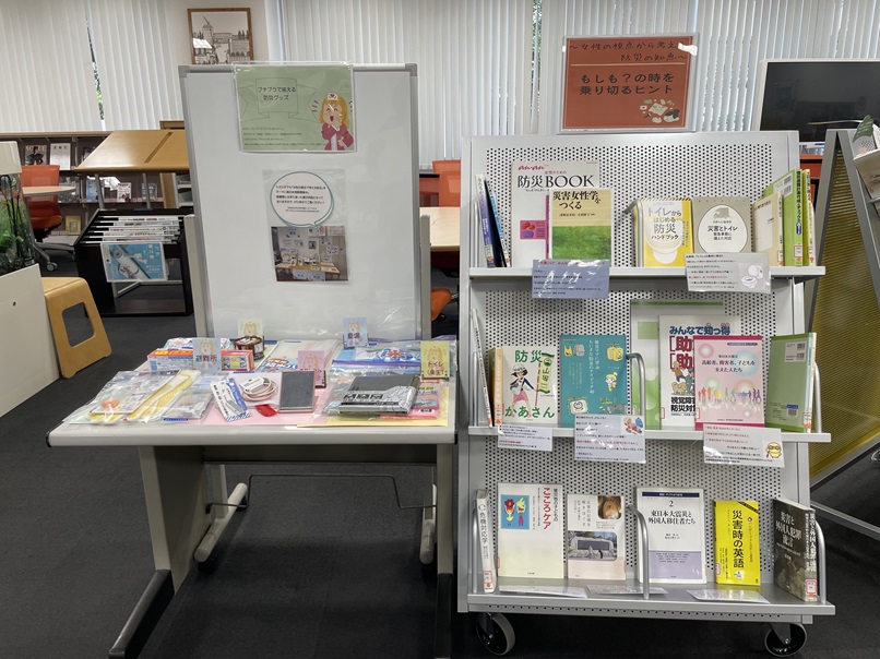 図書館では、9月1日の防災の日にちなみ、ミニ展示「もしも?の時を乗り切るヒント~女性の視点から考える防災の知恵~」を開催中です。