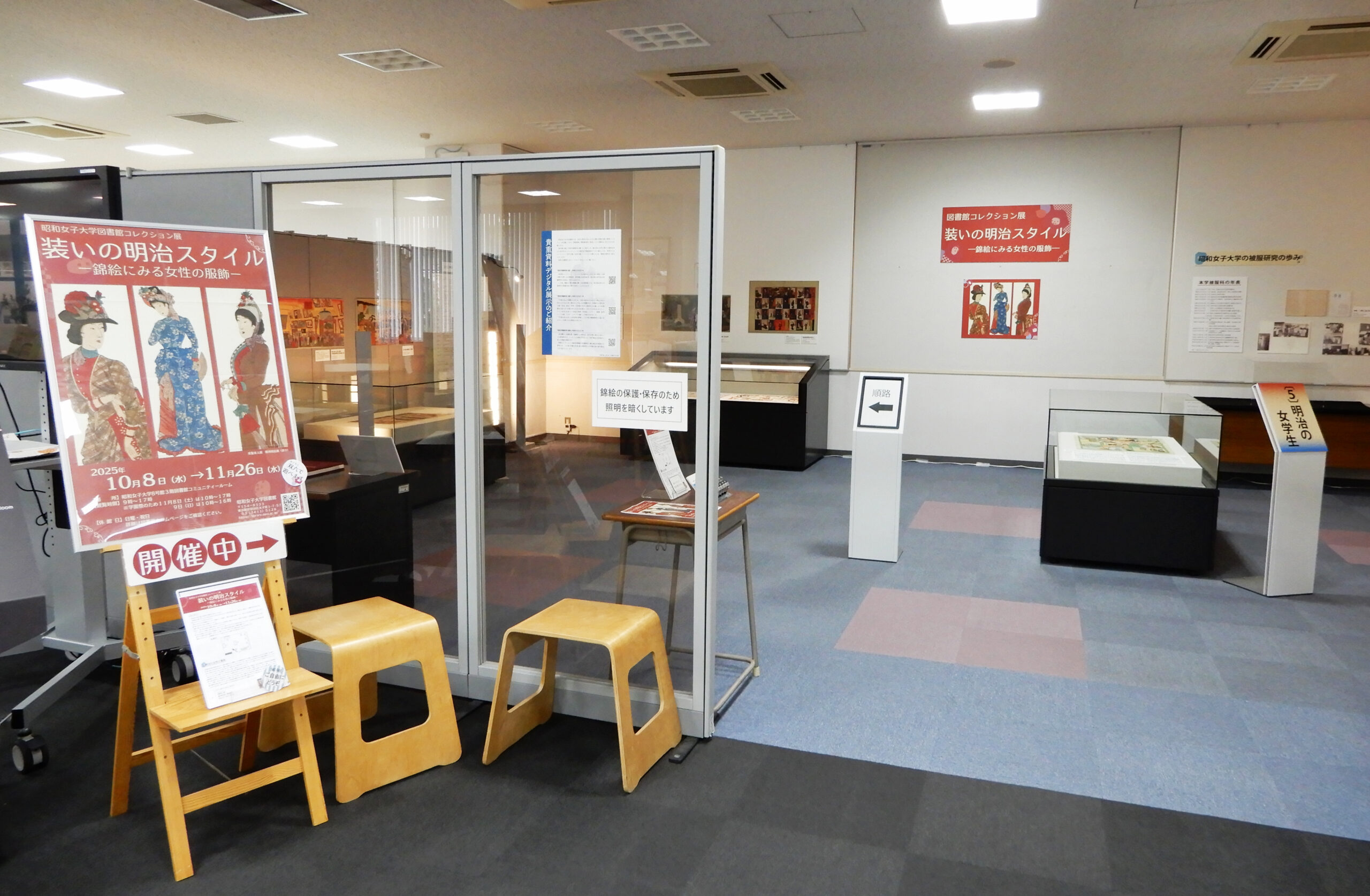 図書館3Fコミュニティルームでは、図書館コレクション展「装いの明治スタイル ―錦絵にみる女性の服飾―」を開催中です。