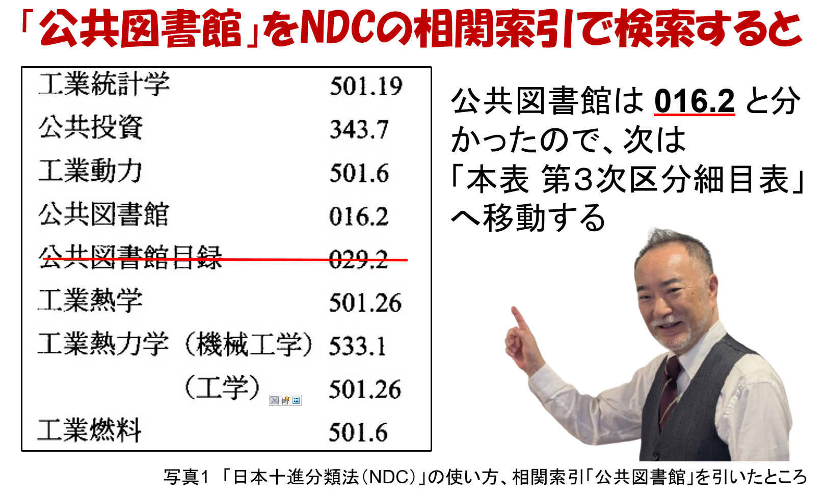 写真1は、ある本の分類記号を求めている途中の場面です。ここでは日本語の本(和書)を対象に、分類のルールブック「日本十進分類法(NDC)」の使い方を説明しています。