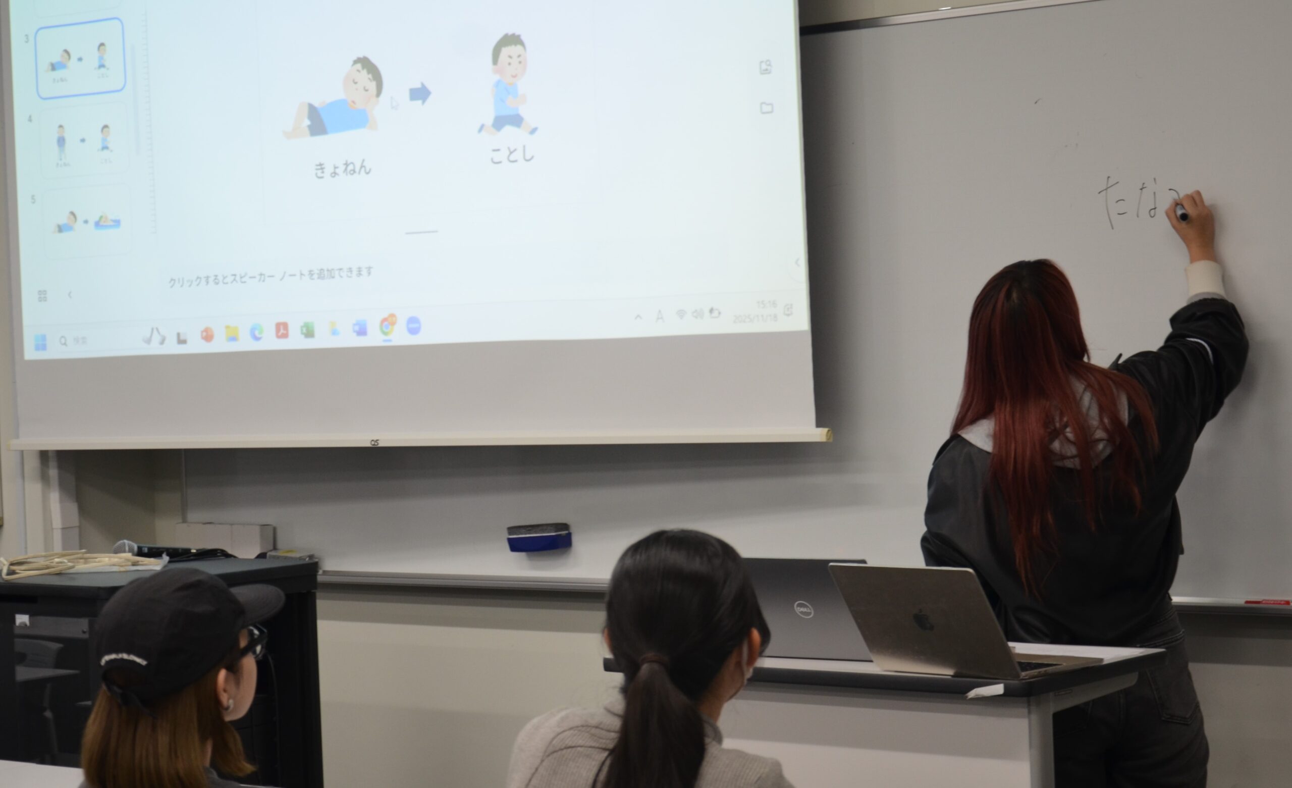 今回のブログは、「日本語教育Ⅰ(日本語指導実践)」という授業の風景です。この授業は、日本語を母語としない人に、日本語を日本語だけで教える方法(直接法)を、実践を通して学ぶ授業です。この授業では、受講生が教師を務め、日本語学校から招いた日本語学習者に授業を受けてもらいます。今回は、その前の模擬授業の様子を紹介します。
