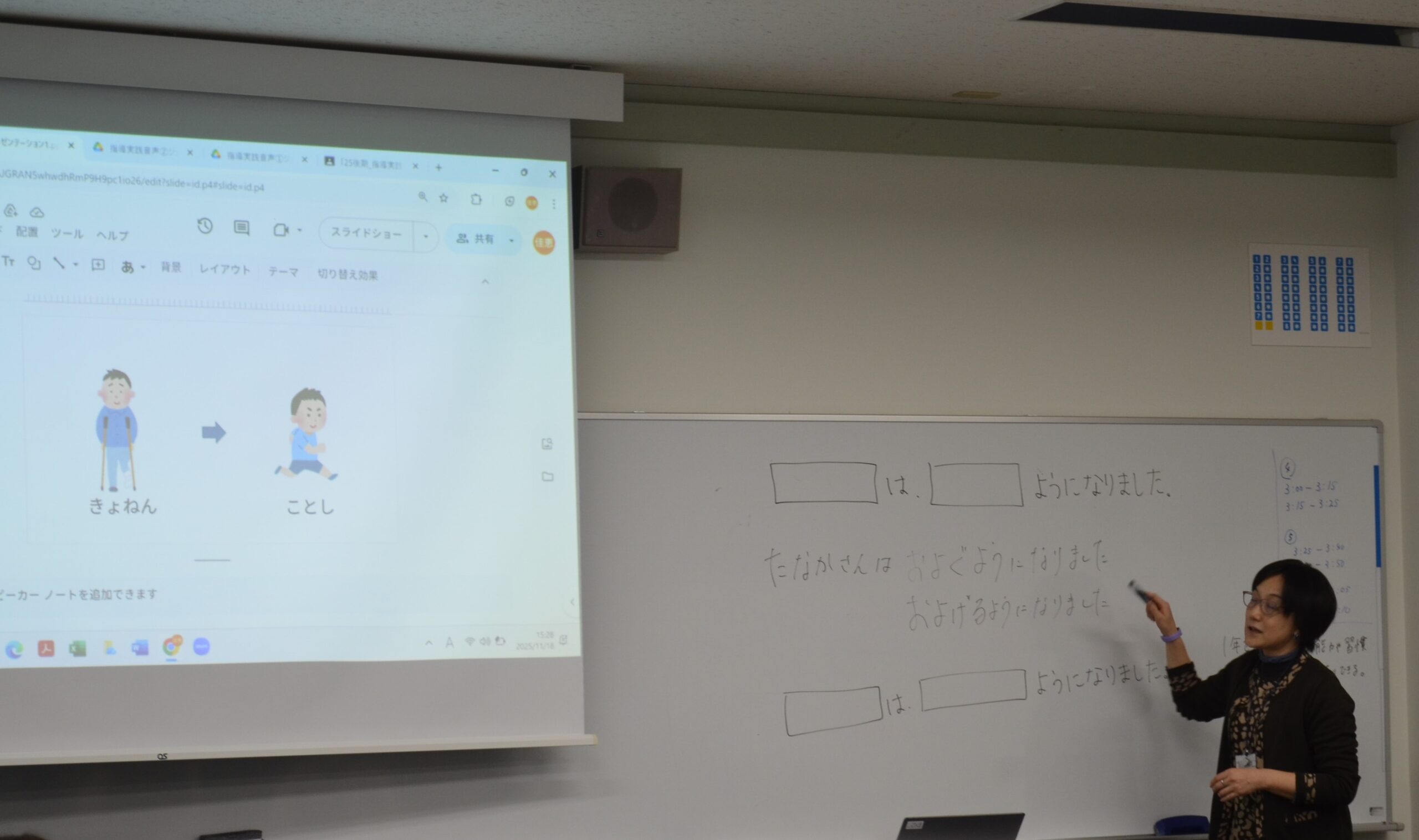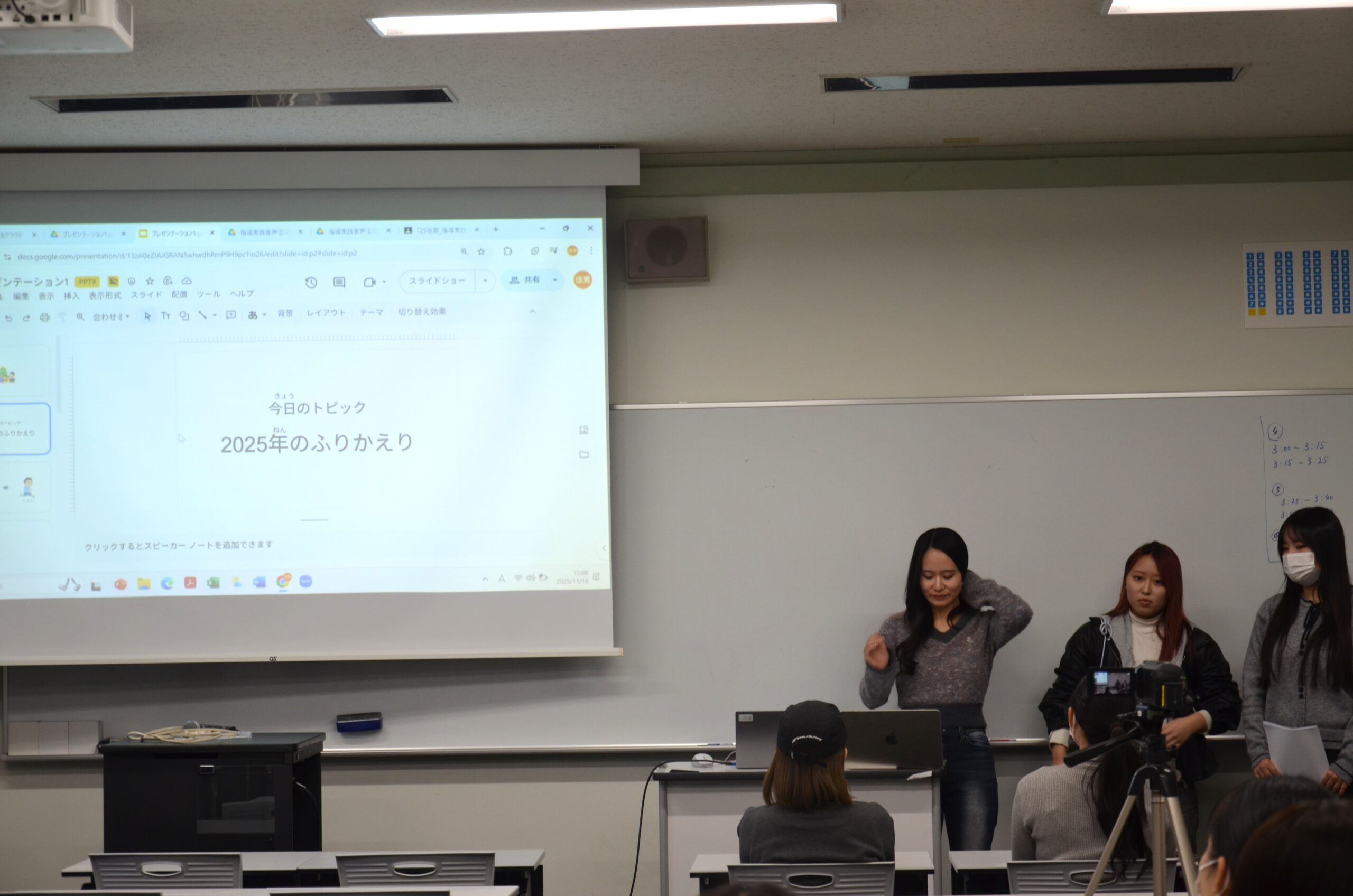 模擬授業は、班で準備をして実施します。1班は、「2025年を振り返る」というテーマで「日本語学習者が、日本に来てからどんな変化があったかを話すこと」を目標にして授業を行います。