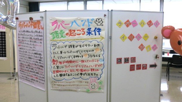 錯覚班では、これまでの展示だけでなく、新しい試みとして、ラバーハンド錯視と重さの錯覚の体験コーナーを設けました。錯覚が起きる人も起きない人もいましたが、たくさんの方に興味をもってもらうことができました。