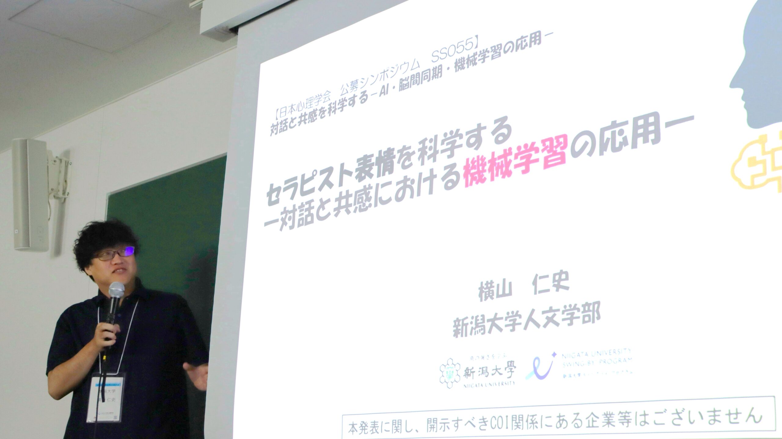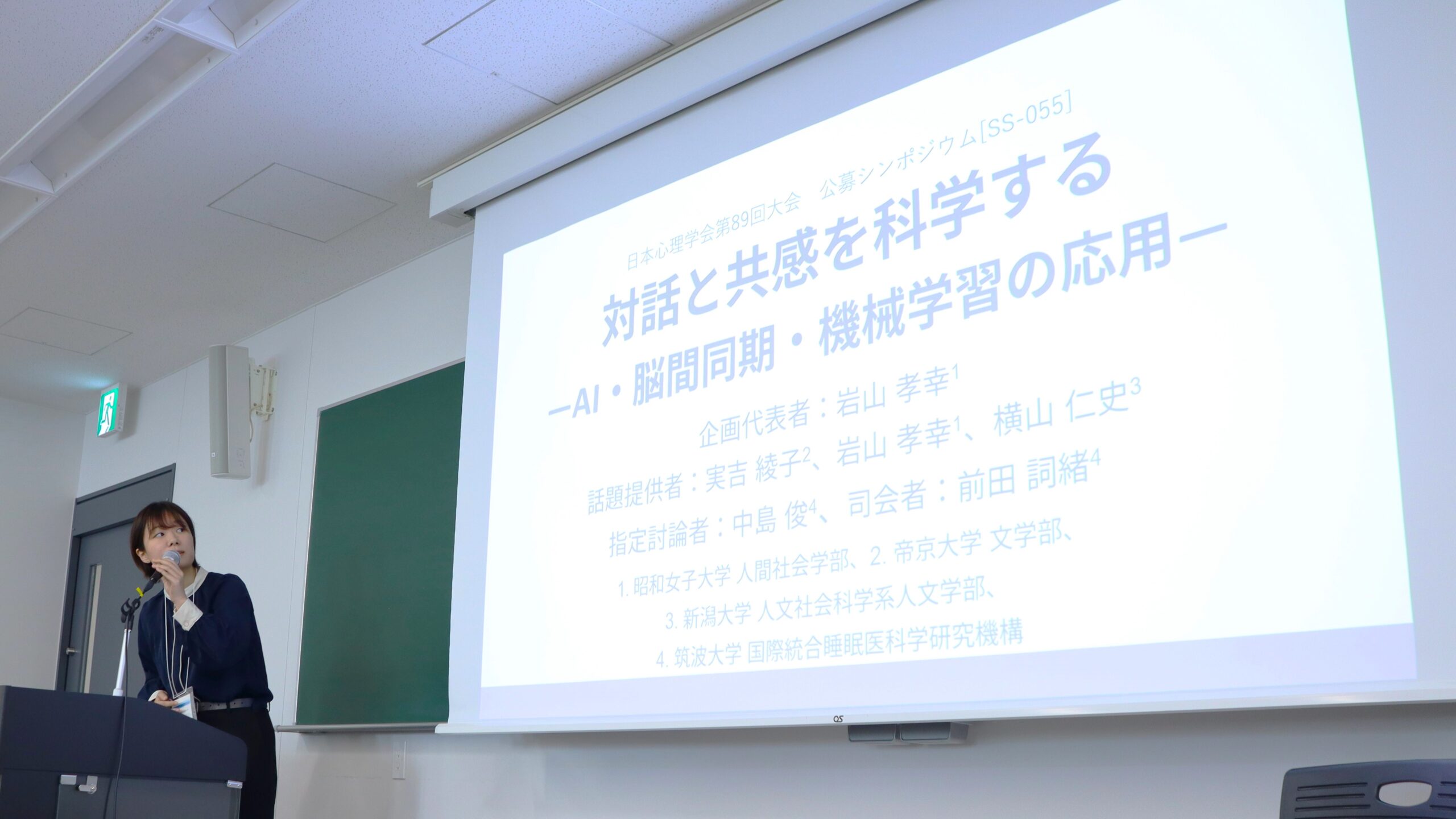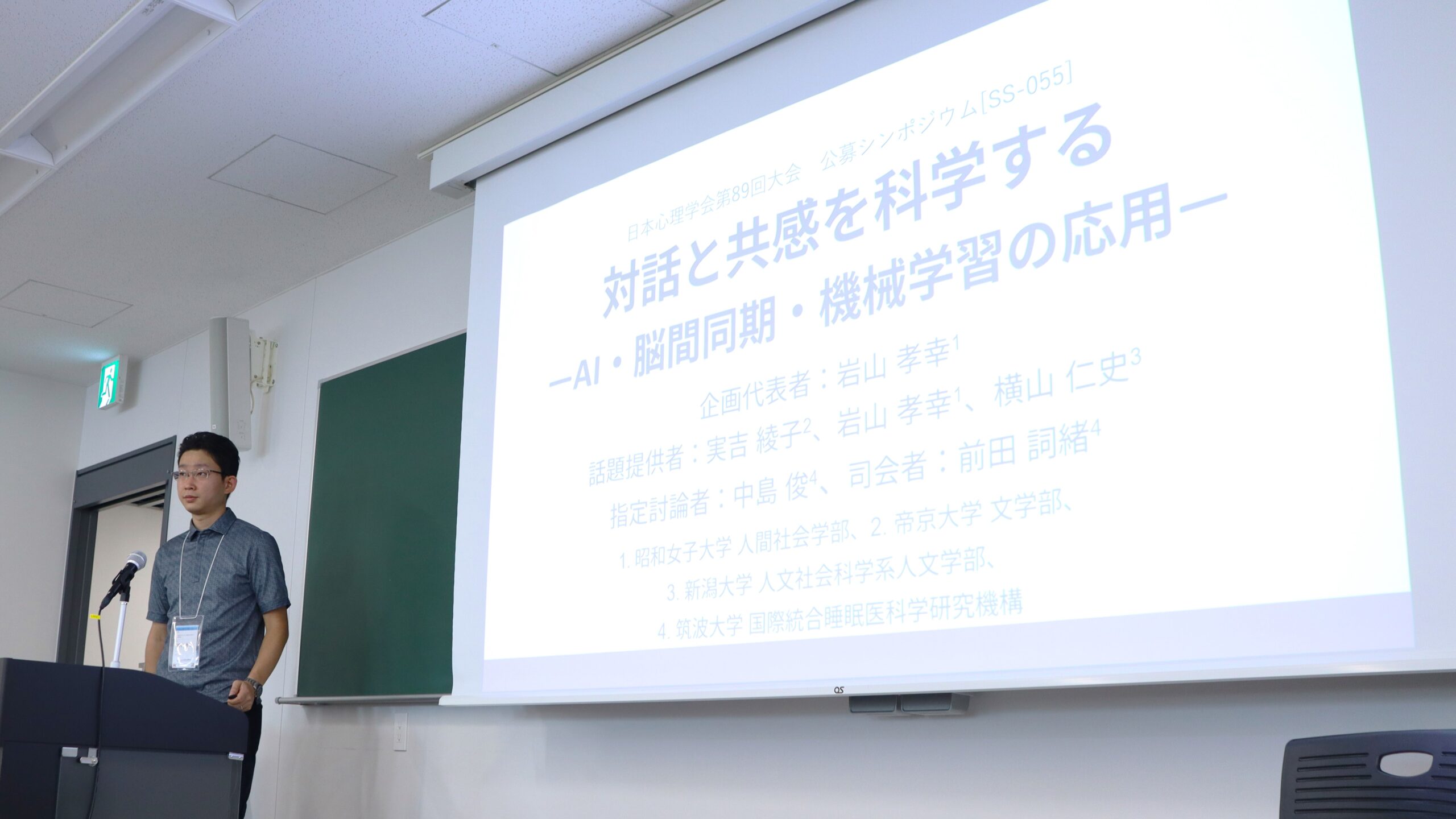 3日目は心理学科・専任講師の岩山孝幸先生(臨床心理学分野)が公募シンポジウム「対話と共感を科学する―AI・脳間同期・機械学習の応用―」の企画代表者・シンポジストとして、対話場面における脳間同期(IBS: Inter-Brain Synchrony)🧠について話題提供を行いました。
