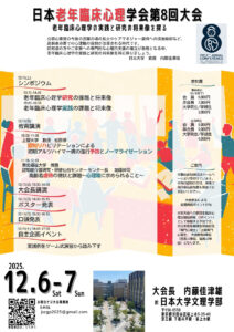 12月6日(土)と7(日)に、日本大学文理学部(世田谷区下高井戸)にて、日本老年臨床心理学会第8回大会が開催されます。
