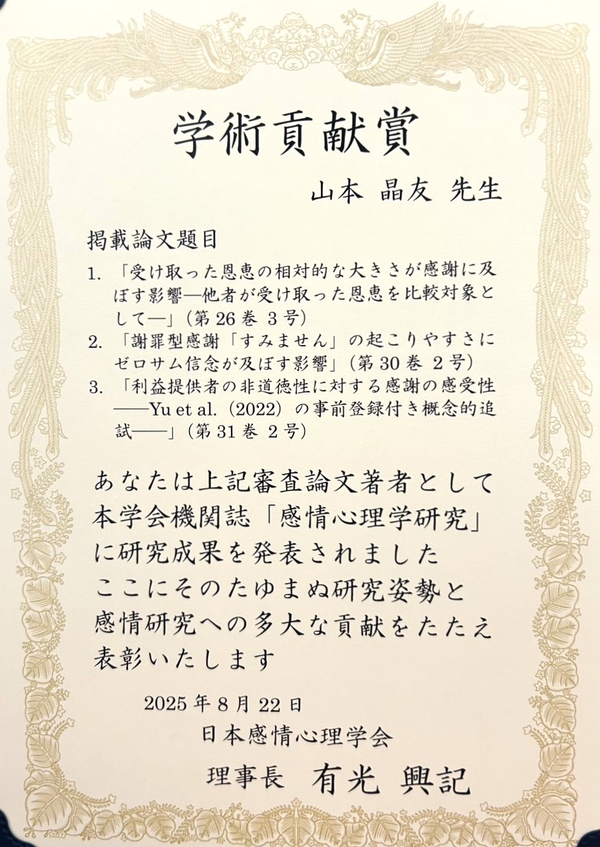 2025年10月25日ー26日にライトキューブ宇都宮で開催された「日本感情心理学会」 の第33回大会において、本学心理学科 専任講師の山本晶友先生が学術貢献賞を受賞しました👏