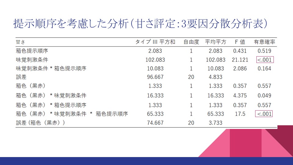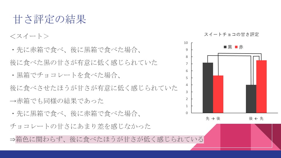 実験の結果、箱色の効果はありませんでした。一方で、順序を考慮した追加分析を行った結果、甘いチョコレートの場合、どちらの色から先に食べても、2枚目の方が甘さは低く評価されるという結果になりました💡