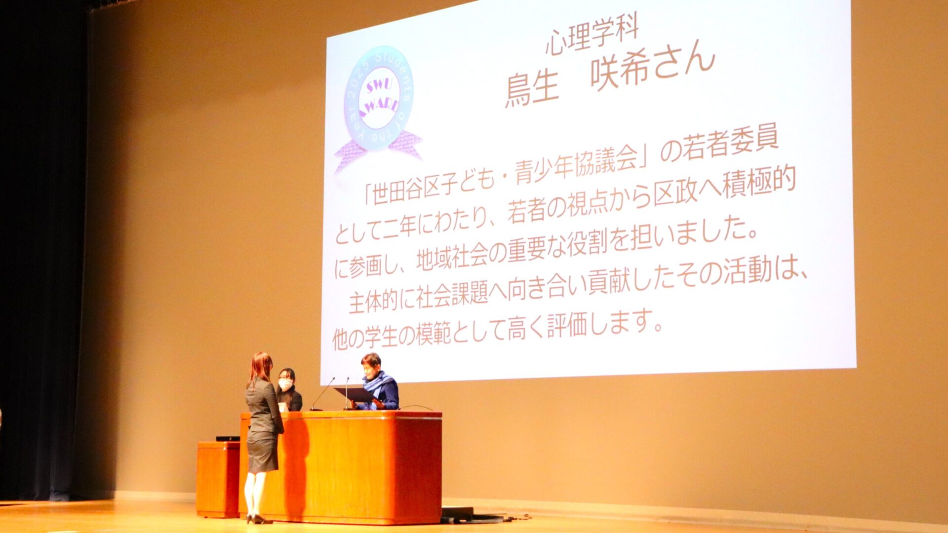 STUDENTS OF THE YEARは、1年間に学内外で活躍した学生に大学から贈られる賞で、今年は心理学科4年生の鳥生さんが受賞しました🎉