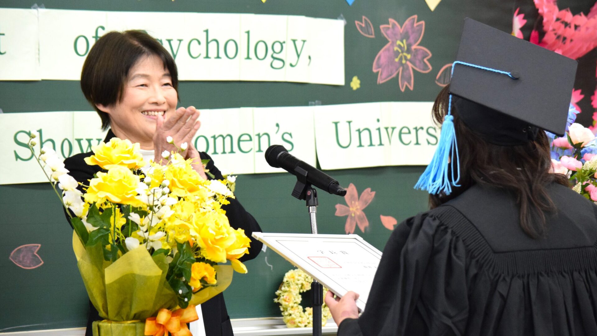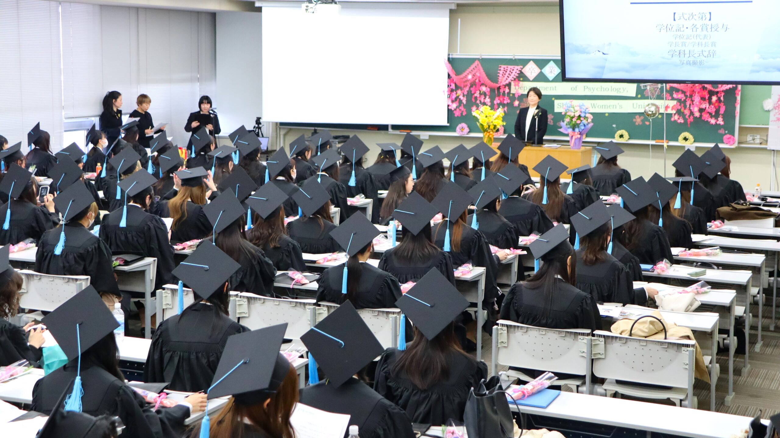 大学全体での式のあとは、4年間過ごした使い慣れた教室へと戻ります。 ここでは、心理学科の教職員が見守るなか、学位記や各賞賞状の授与式を行いました。