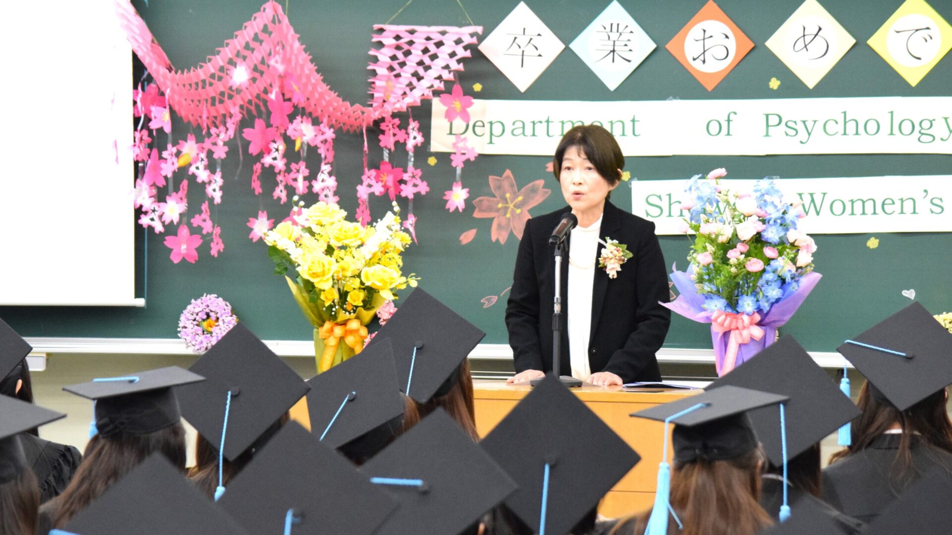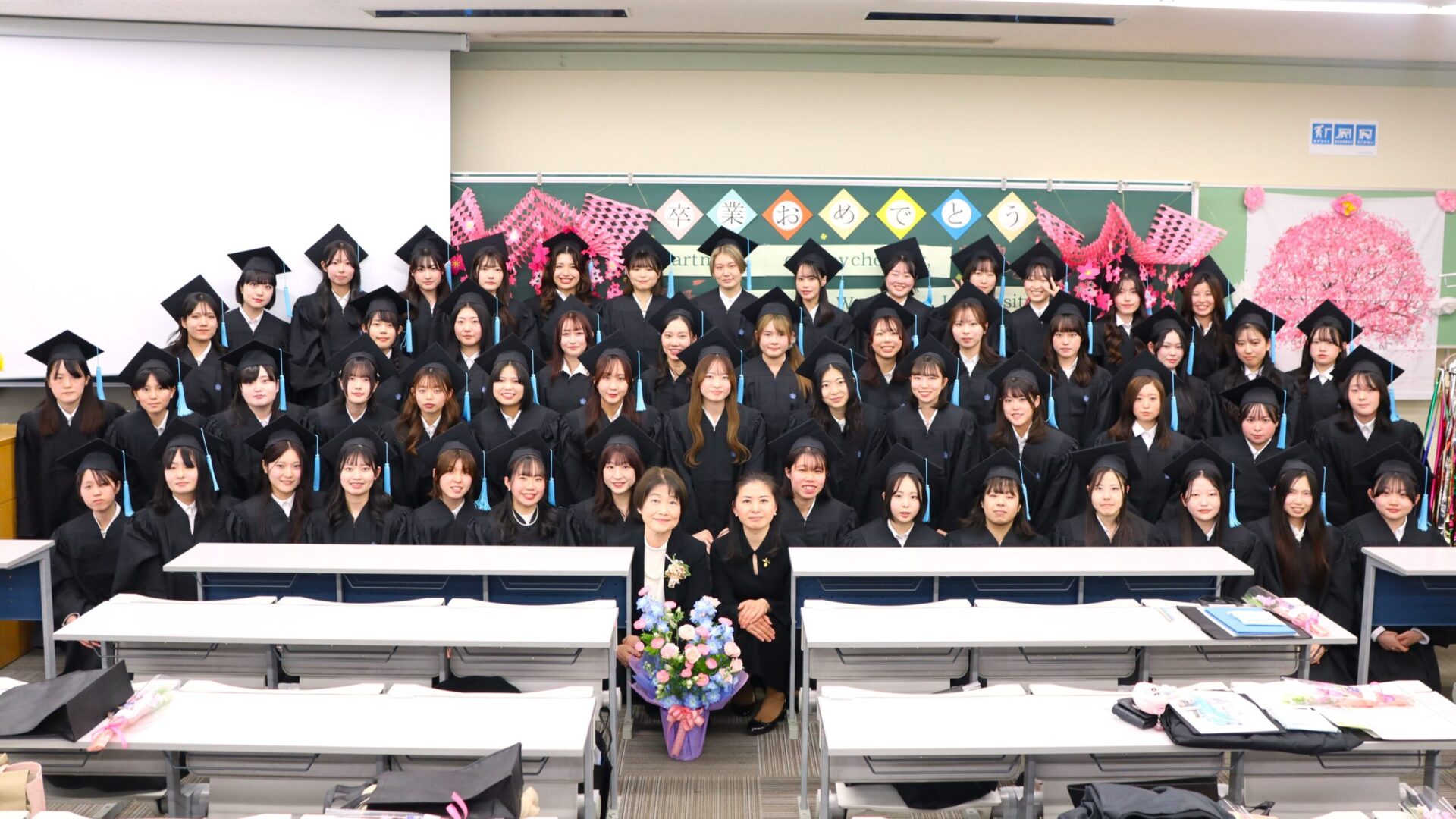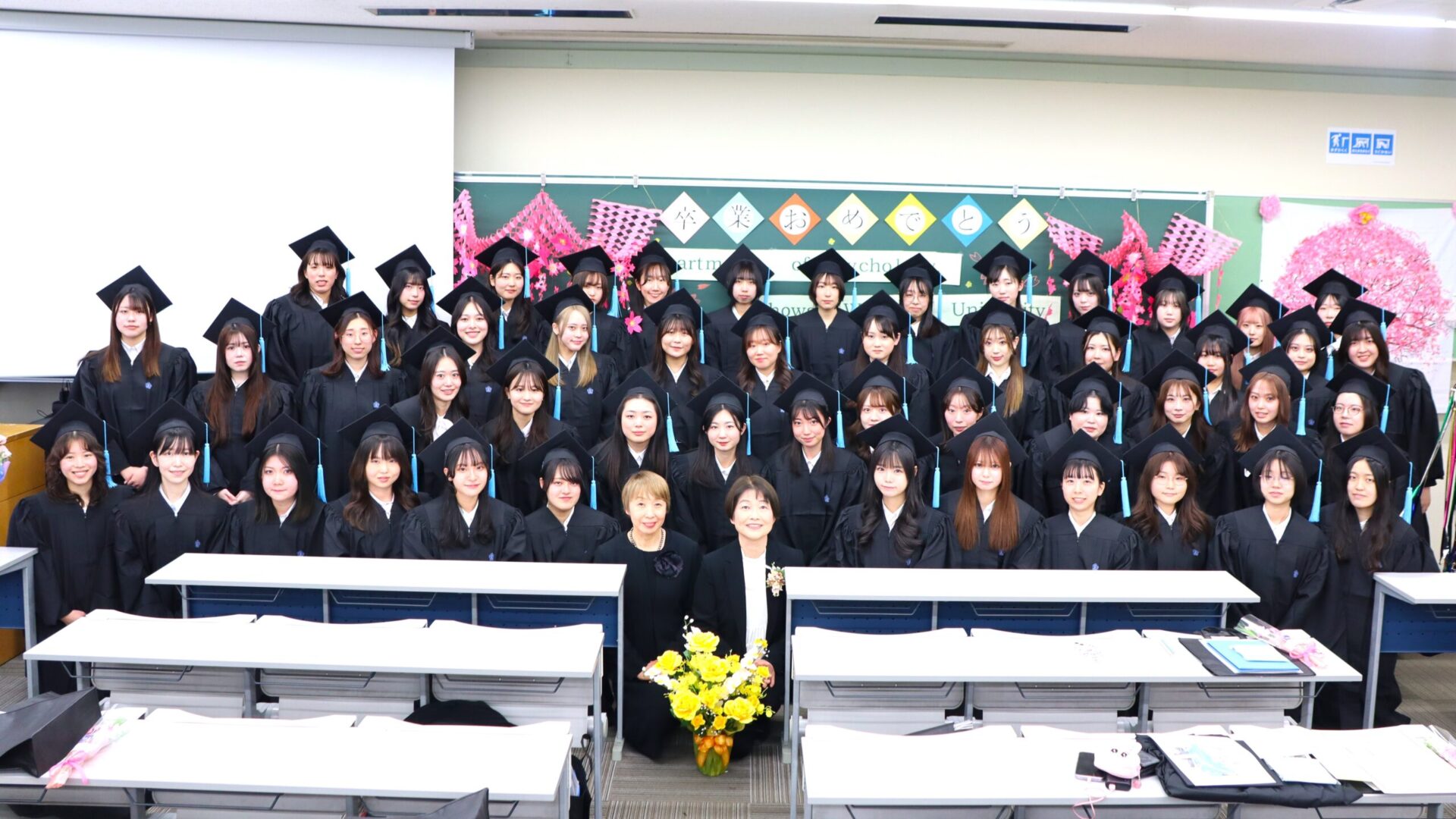 後輩たちが心を込めて華やかに装飾してくれた教室は、卒業生たちの晴れやかな笑顔で溢れ、心理学科らしい、和やかなお祝いの場となりました🎉